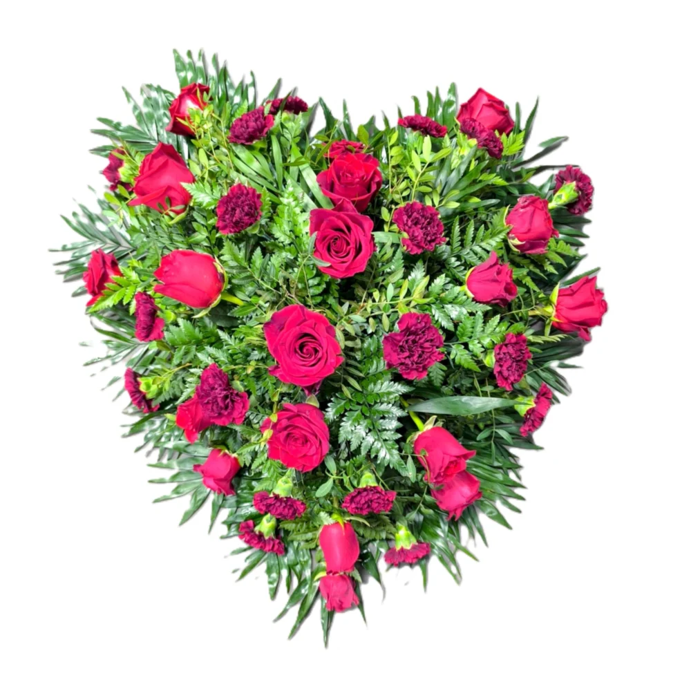 Wieniec leżący, w kształcie serca, wykonany z miksu kwiatów czerwonych. Jeśli zależy Państwu na innej kolorystyce wieńca prosimy o wpisanie takiej informacji w polu uwagi.