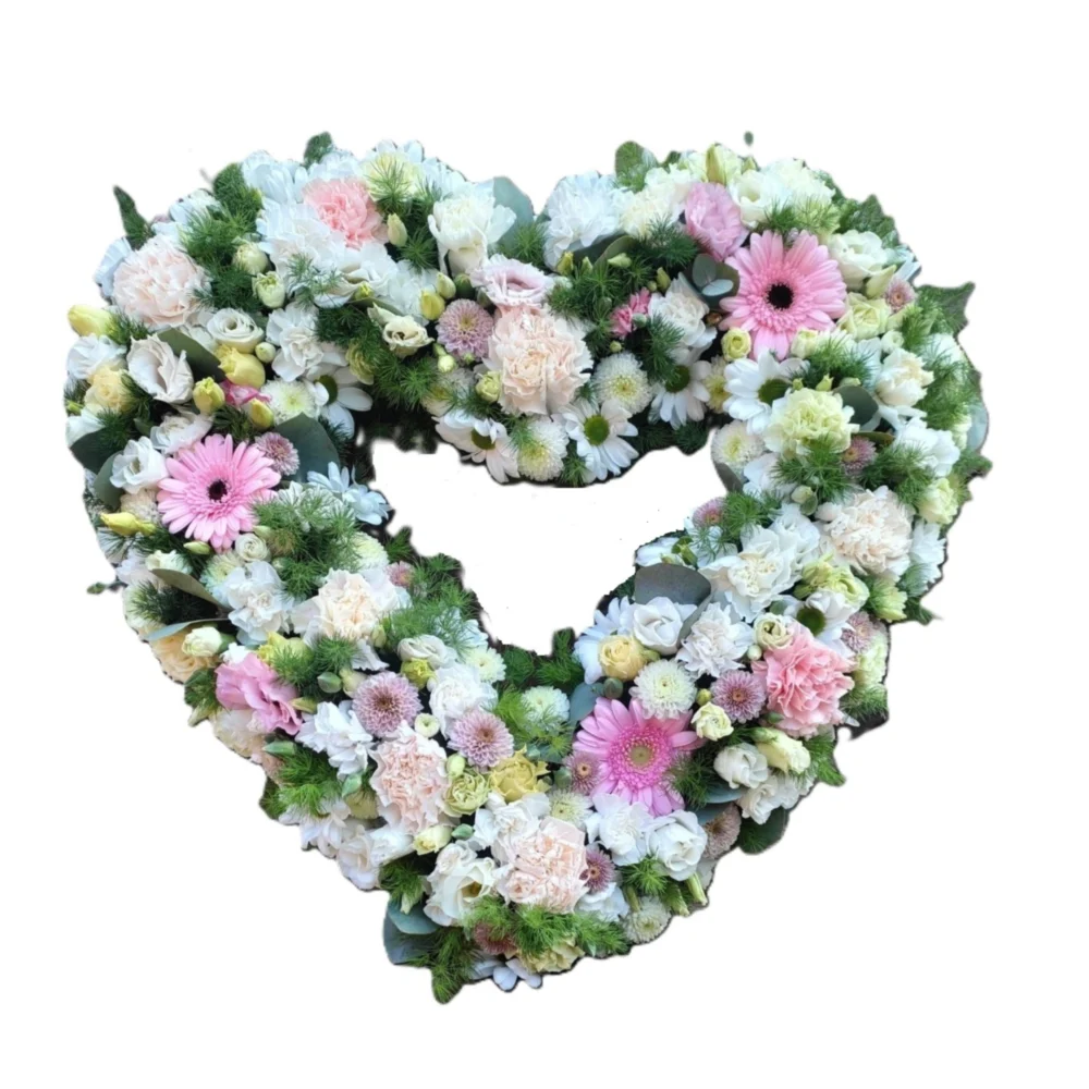 Wieniec leżący w kształcie serca. Wykonany z mieszanki kwiatów. Jeśli zależy Państwu na innej kolorystyce wieńca prosimy o wpisanie takiej informacji w polu uwagi. Zdjęcie ma charakter poglądowy- ostateczny dobór kwiatów w wieńcu zależy od sezonu i ich dostępności.